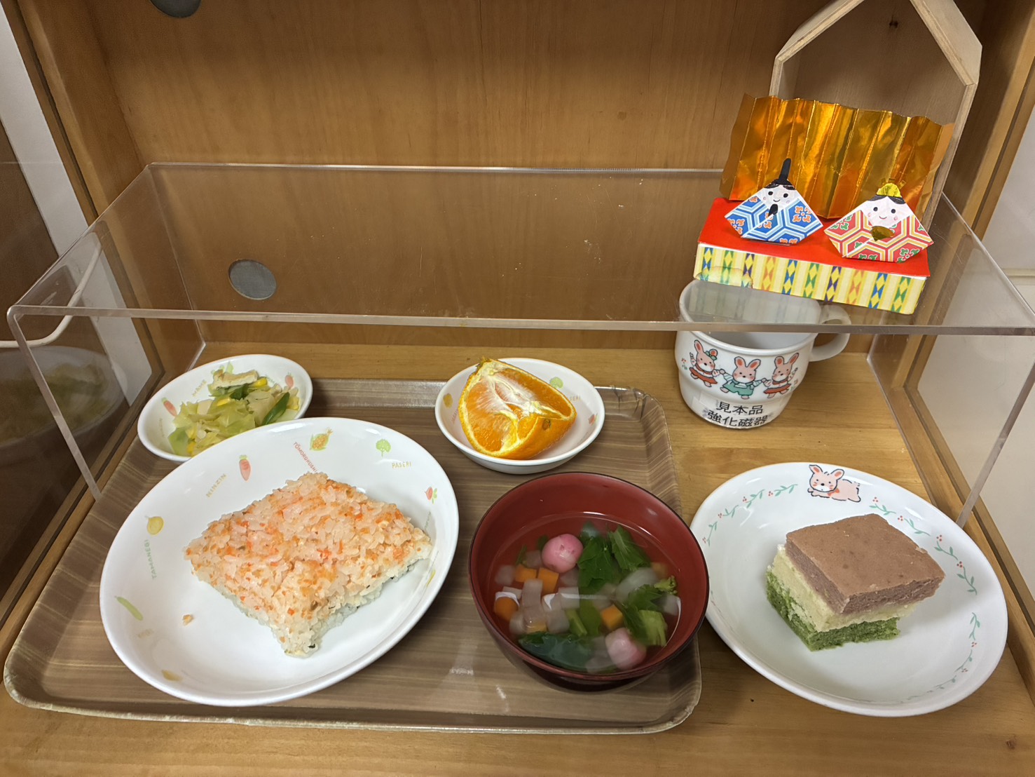 ひしもち風押し寿司に手まり麩のすまし汁、おやつもひしもち風ケーキとひな祭りらしいメニューとなりました。